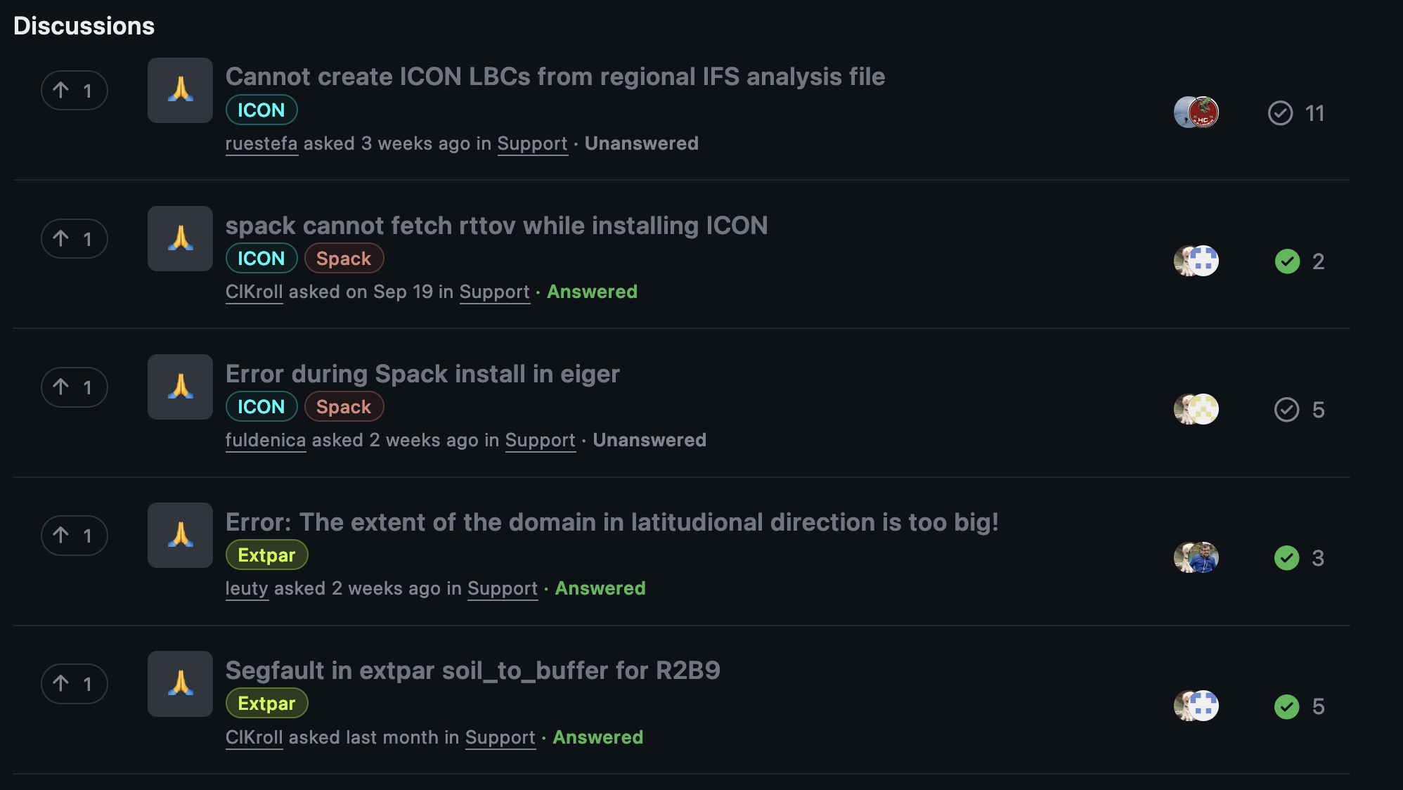To request regular support, please use our discussion forum . The Core Team will be notified and will respond as soon as possible. In addition, all C2SM members can participate in these discussions and help as well.
